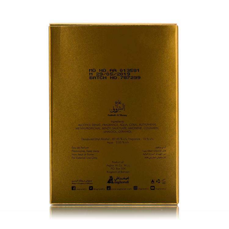 Experience the invigorating fragrance of BAKHAKH AL SHUROOQ, harnessing the freshness of marine scents that are perfect for warm weather use but invigorating with notes of woody textures to last long. This spray when consumed, gives off rich proportions of opening notes: of zesty fresh green lemon and orange notes. The heart however transcends to a fruity peachy and apple note with its beautiful aroma from flowery ascends like lilies, rose, jasmine and cypriol. A sharp and woody base are catered from patchouli, cedar, sandal, amber and balsamic mossy. BAKHAKH AL SHUROOQ simply looks elegant presented in a 100ml capacity.